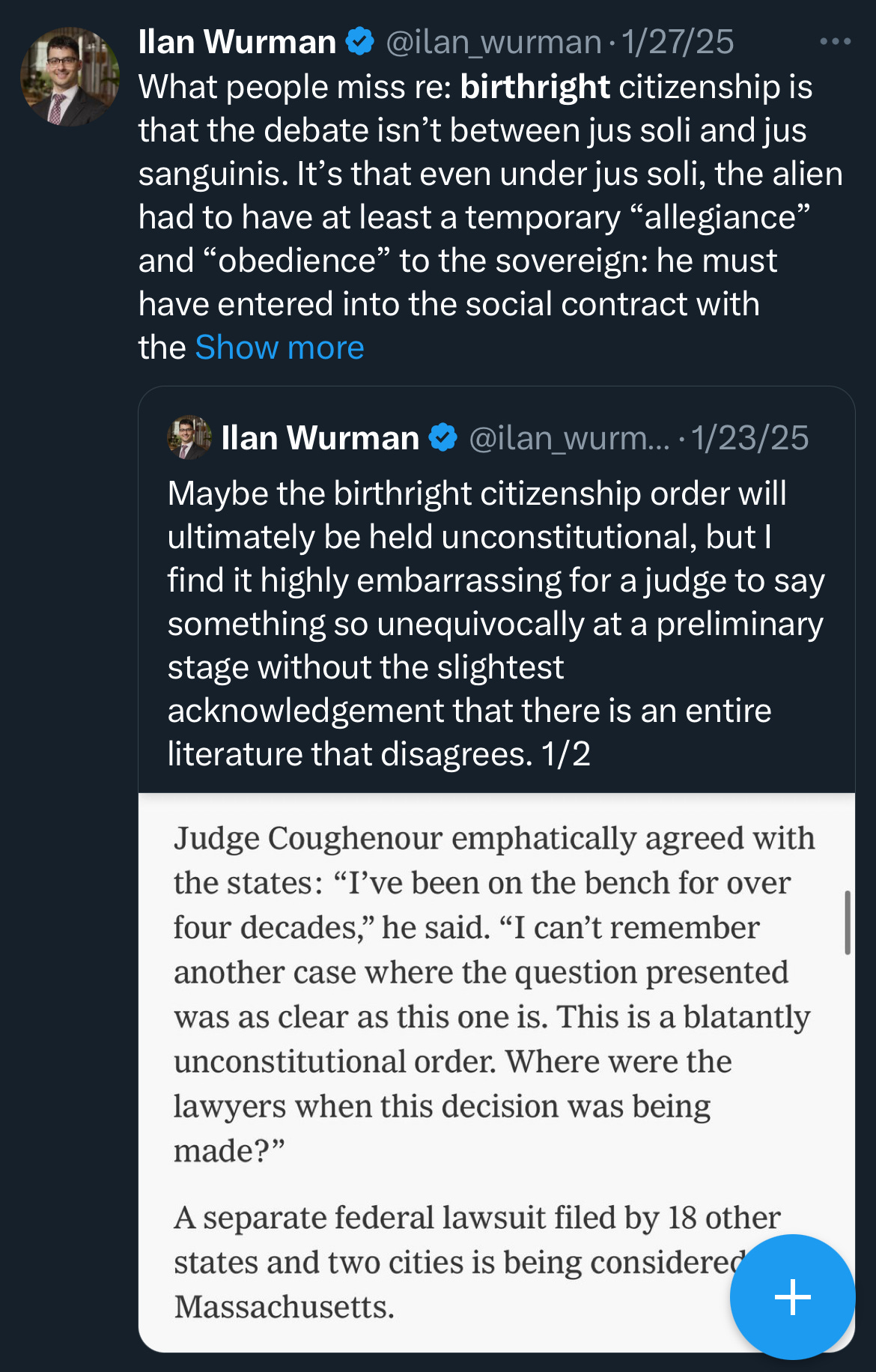 Or how about Minnesota Law’s Ilan Wurman and Georgetown’s Randy Barnett. A few weeks back, no less than the New York Times offered the pair the pulpit to offer some bullshit excuse for Trump’s executive order gutting birthright citizenship. Even before that, Wurman was running his mouth about it on Twitter: