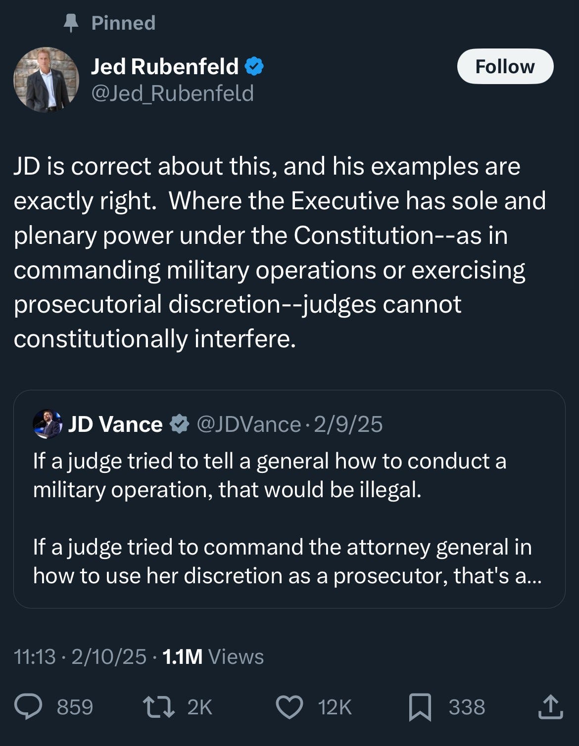 Consider Yale’s notorious sex-pest, Jed Rubenfeld, who a few weeks back weighed in on JD Vance’s deliciously stupid take about Federal judicial authority to check executive misconduct (remember, the take so incredibly dumb that I only had to crack open my baby law textbook to demolish it?):