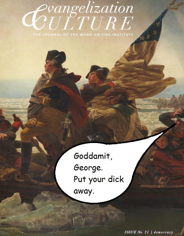Barron & Co. might try to hide the ball, but credit where it’s due, they don’t delay it. Underneath the platitudes (“Catholicism not only supports democracy. It is, in fact, democracy’s greatest friend.”) (3), Word on Fire Institute Director Dr. Matthew Petrusek introduces the volume’s shallow, dictionary concept of democracy: “power to the people”—dismissing the form of governance as a mere “procedural system” prone to transform “naked self-interest” into “majoritarian domination,” lacking “any moral validity at all” unless “grounded in pre-democratic values that exist prior to, and out of the reach of, voters’ whims” (3). Dr. Tod Worner, the magazine’s managing editor, adds that “democracy occasionally yields a well-honed product,” before charging (without offering specifics) that American democracy has “devolved to a point where a bill serving almost any [really?] interest or appetite (no matter how heinous) can be passed into law without dispute [again, really?] if there are enough votes and an abstaining [paging E. Burke on line 3] veto pen” (7, 9) (let’s try to ignore him pegging the “horror of” “the Nazi experiment” on “democracy gone wrong” while lauding the adolescent Weimar Republic as “a modern, sophisticated democracy”) (5–6).